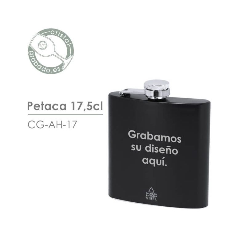 Personaliza esta elegante petaca de acero con el diseño de grabado que necesites. Un dibujo original, el logotipo de tu negocio, una frase divertida.