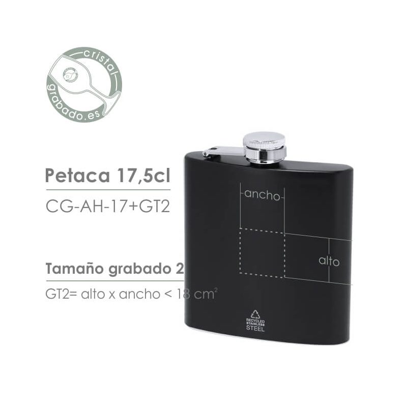 La petaca tiene unas dimensiones de 11 cm de alto por 9,30 cm de ancho y 2,50 cm de profundidad y 17,5 cl de volumen.