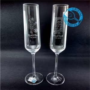 Copas de Champán personalizadas para el brindis de novios en la Boda. En cristalgrabado personalizamos copas de champán para el brindis de los novios el día de su boda. El diseño de personalizado más habitual lleva el nombre de los novios, dibujo de alianzas, fecha del enlace... Pero podemos personalizar las copas de champán con el diseño que desee... Un dibujo representativo de la personalidad de los novios, el sello de boda que han utilizado los novios para las invitaciones, un logotipo o anagrama con las iniciales de la pareja... Si no tiene diseño o sello de boda, solicítenos alguno de nuestros diseños de ejemplo. Las copas de champán grabadas serán un detalle y un recuerdo perfecto para ese día tan especial.